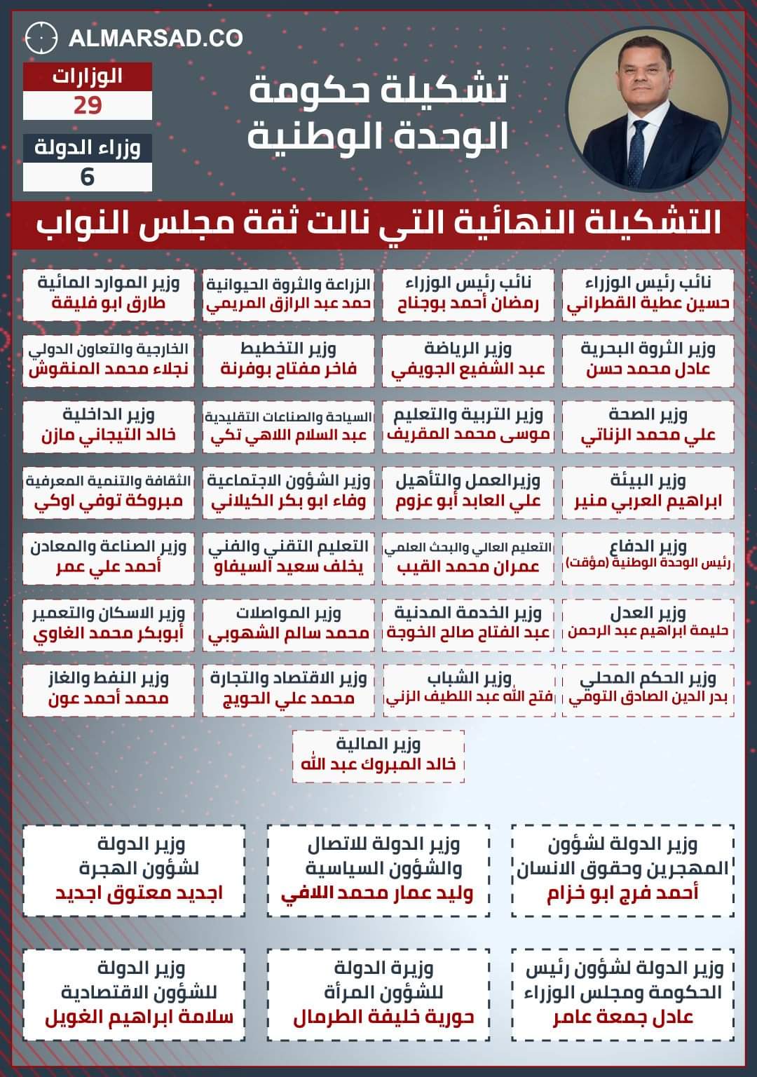 كما قلت صبي الصلابي وبلحاج حصل علي وزير الدولة للشؤون السياسية و ذراعهم الاخر لمياء ابوسدرة حصلت علي وزارة الخارجية اختيار ذكي منهم فهيا مرأة غير محجبة ستلقي انتقاد من الشارع (تم رفض تعيينها وزيرة للاعلام ف 2014 لانها غير محجبة) ولكن لن يتم الانتقاد من النخب السياسية ولكن لمياء عضوة حزب الوطن برئاسة عبدالحكيم بلحاج