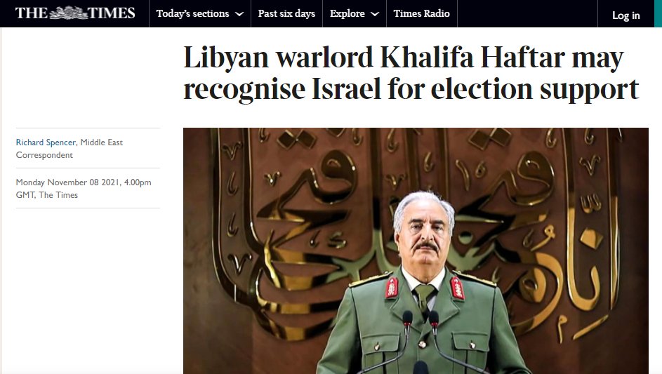 هو لسه يبي يحكمتقرير لـ"التايمز" بعنوان: "أمير الحرب (حفتر) قد يعترف بإسرائيل كي تدعمه في الانتخابات".