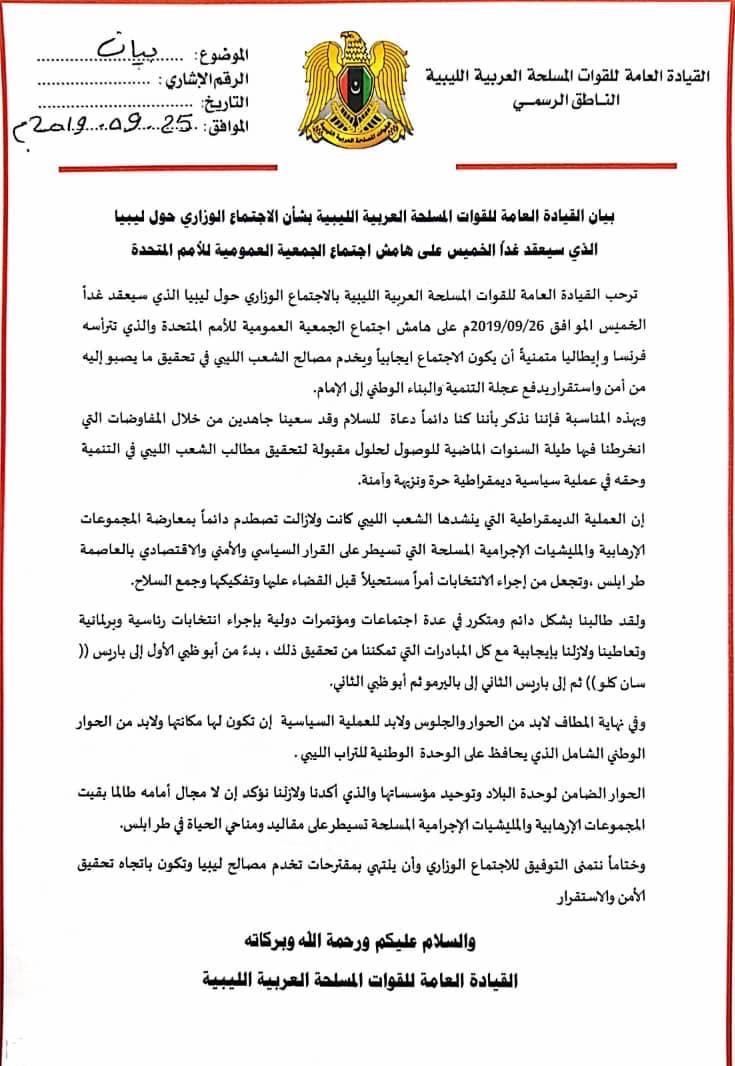وختمت القيادة العامة متمنية التوفيق للاجتماع الوزاري وأن ينتهي بمقترحات تخدم مصالح ليبيا وتكون باتجاه تحقيق الأمن والاستقرار .