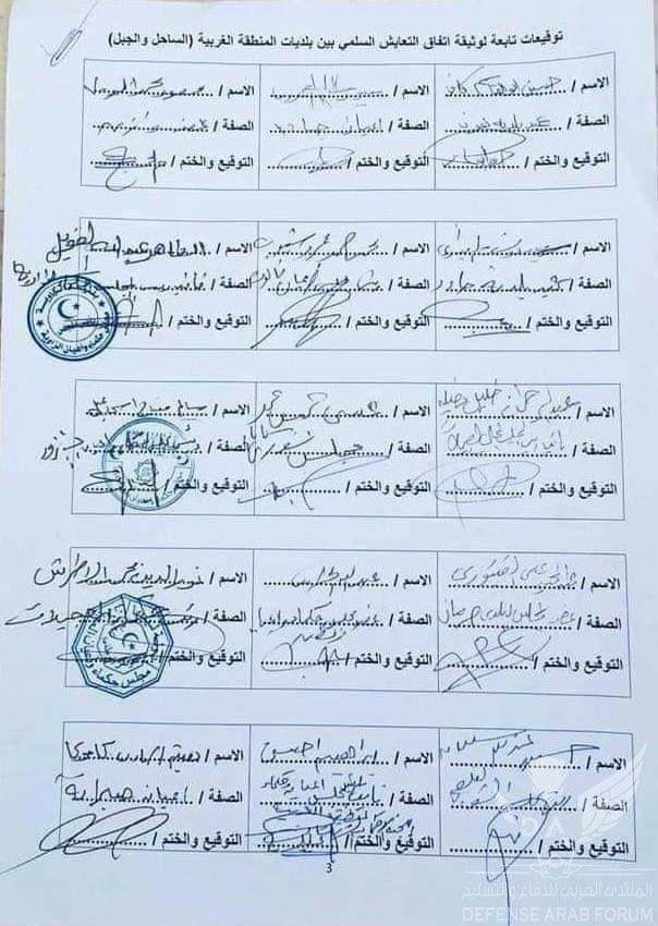 مشايخ زوارة و الزاوية تم توقيع ميثاق لايدخل الجيش الى مدينتهم وعدم الهجوم من طرفهم علي مناطق القوات المسلحة وتم وضع قوة في جميع المدن علي الساحل والجبل هي قوة تأمين فقط وليست لخوض المعارك..