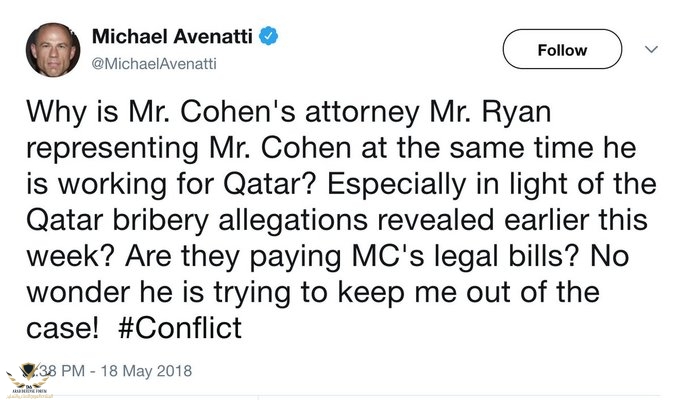 محامي الممثلة الإباحية التي تدعي أن ترامب أحد زبائنها (هناك دعوى منظورة) قام بنشر فيديو يظهر فيه وزير خارجية قطر "نامق" وأحمد الرميحي في زيارة ل "كوهين" محامي ترامب في مكتبه ببرج ترامب..