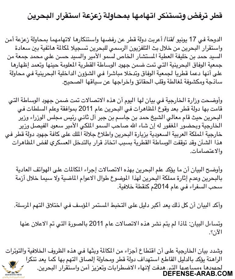 بيان الخارجية القطرية بشان الاتصالات التي نشرها التلفزيون البحريني يؤكد صحة التسجيلات لكنها مقتطعة.