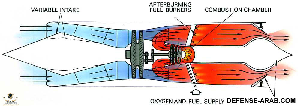 ويحتوي المحرك على مدخل هواء متحرك و انبوب نفاث متغير في الجزء الخلفي , وتصل سرعة هذا النوع من المحركات نحو 3 ماخ , حيث في الشكل الاول في الصورة أعلاه يوضح وضع المحرك أثناء الاقلاع والهبوط , بينما الشكل الاخر حيث يمثل المحرك من ناحية الطيران والوصول إلى اقصى سرعة ممكنة .