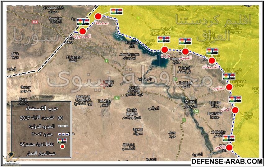 انباء مسربة عن اتفاقية الموصل حول المناطق المنتنازع عليها شمال وشرق الموصل وانسحاب قوات البيشمركة الى حدود 2003 ( الخط الازرق ) سيتم الانسحاب من كافة المناطق باستثناء شمال مثلث فيشخابور وتم تحديد ثمانية مناطق تكون في الادارة مشتركة من القوات العراقية والبيشمركة وهي من الشمال الى الجنوب ( المحمودية - سحيلة - فايدة - القوش - الشيخان - مقلوب - الخازر - الكوير ) يبدو ان هناك تدخل للولايات المتحدة من اجل انقاذ المليشيات الكردية السورية ( قسد ) وابقاء حبلها السري مع شمال العراق من خلال معبر المحمودية مع سوريا لان قطع هذا الطريق يعني عزلها بالكامل من الجانبين العراقي والتركي لذلك يبدو ان الاتفاق اعطاء هذا الممر للاتصال مع اكراد سوريا مقابل فتح طريق فيشخابور الى تركيا للجانب العراقي هذا كله تخمين في حالة تاكيد هذه الاخبار رسميا من اي من الطرفين