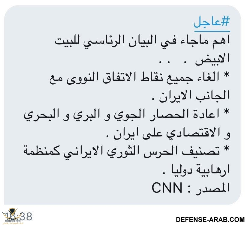 للتصويت على اقرار إعادة العقوبات أو رفضها .... يعني ممكن ترامب يحفظ ماء وجهه ويرسل العبء بالكامل على الكونغرس ويقولهم أنا أشوف أن إيران غير ملتزمة بالقرار ولذلك يجب إعادة العقوبات .... حينها سيكون الكونغرس هو من يتلقى اللوم وفي وجه المدفع وسنشهد شغل لوبيات محترم لم نشهد له مثيل من قبل.