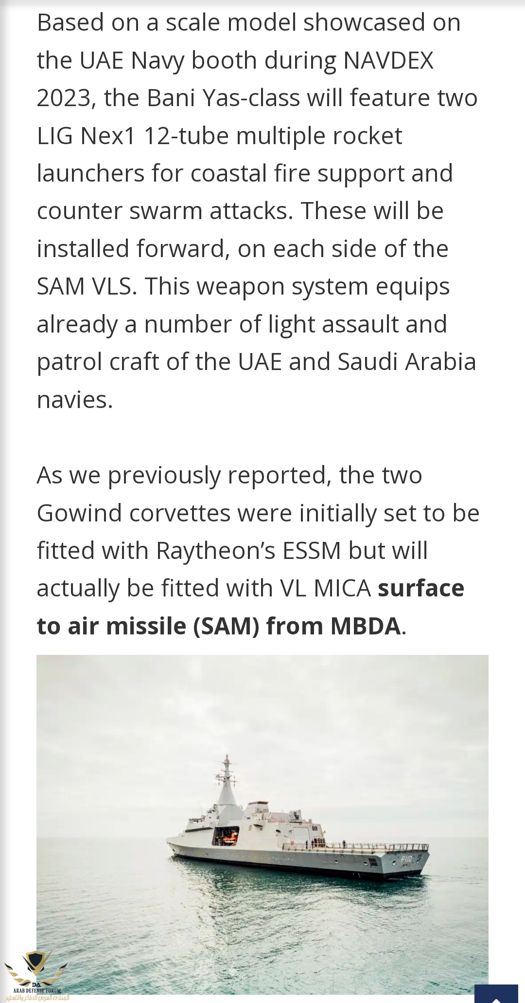 Based on a scale model showcased on the UAE Navy booth during NAVDEX 2023, the Bani Yas-class will feature two LIG Nex1 12-tube multiple rocket launchers for coastal fire support and counter swarm attacks. These will be installed forward, on each side of the SAM VLS. This weapon system equips already a number of light assault and patrol craft of the UAE and Saudi Arabia navies.