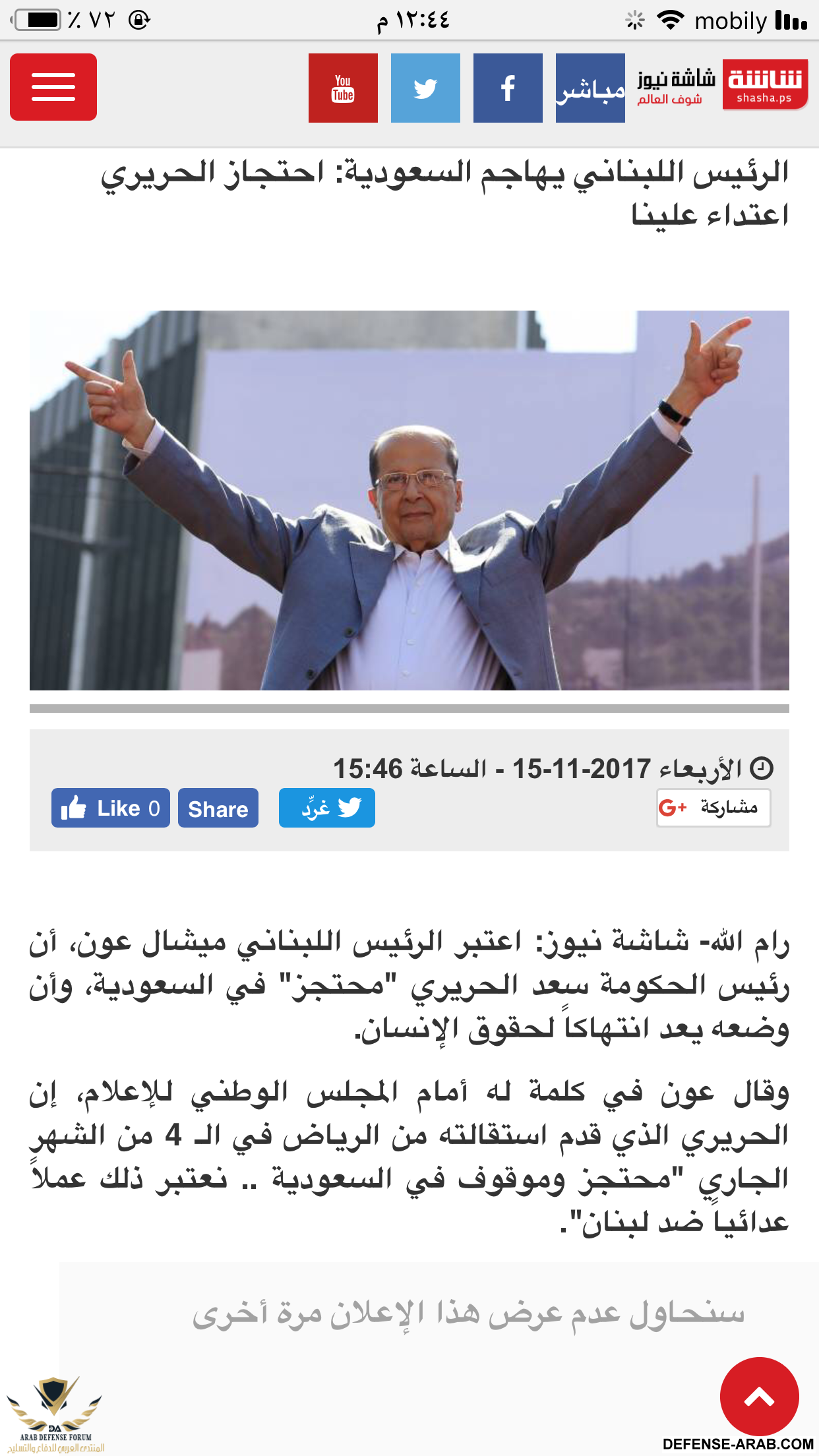 المفارقه العجيبه عند المستعربين مجرد وجود الحريري بالسعوديه اعتبر عمل عدائي اجل تاييد الحوثيين ودعمهم بصواريخ وتدريب ورمي صواريخ على الرياض وش يعتبر ضربه نوويه! وجب الهجوم على لبنان عسكريا!