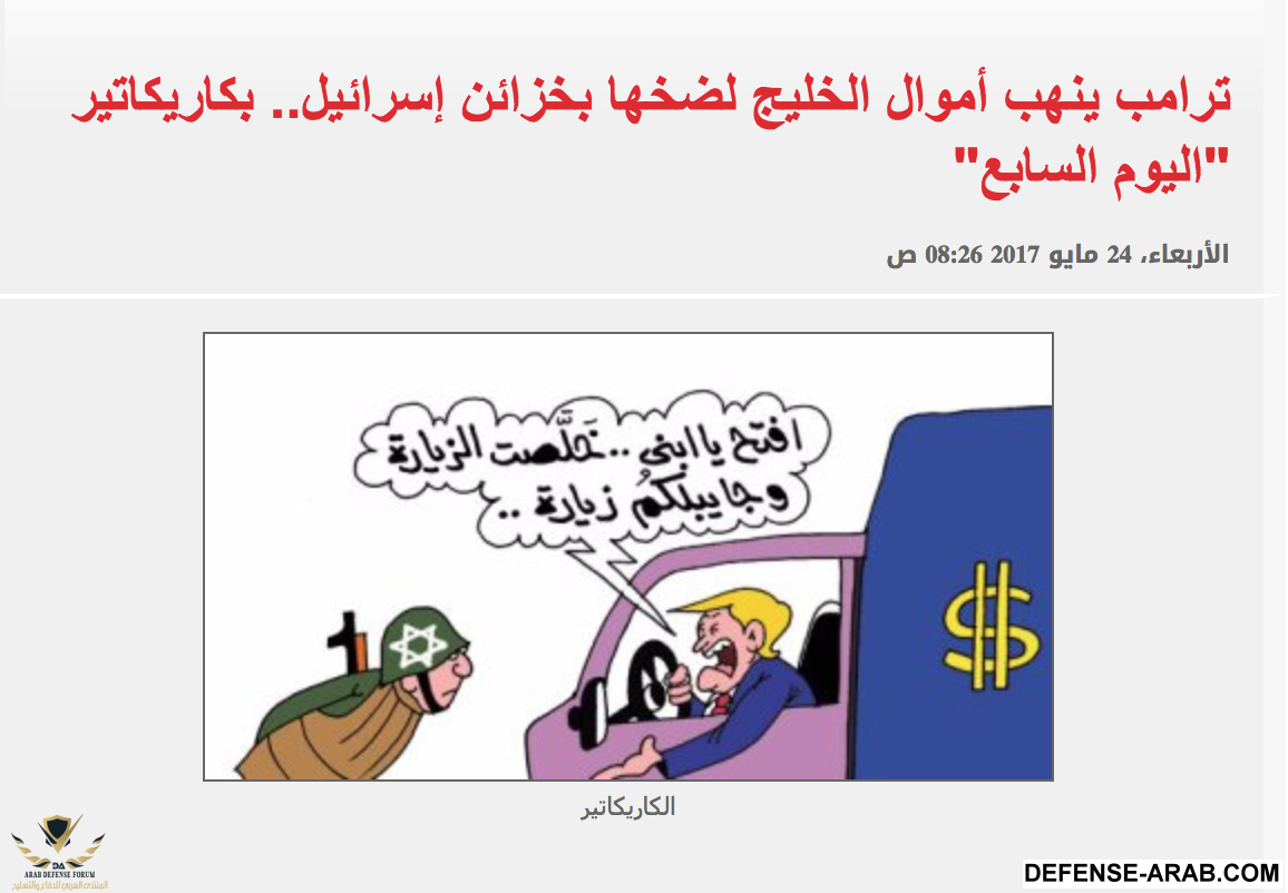 حتى ان الاعلام المصري في تلك الفترة وقد تحسنت العلاقة السعودية المصرية بفضل الرئيس الامريكي دونالد ترامب هاجم زيارة ترامب للسعودية وتحدث عن جزية سعودية لامريكا واسرائيل وكان فيه كاريكاتير حقير في جريدة اليوم السابع لترسيخ مفهوم التبعية السعودية للولايات المتحدة الامريكية ودفع الجزية لاسرائيل.