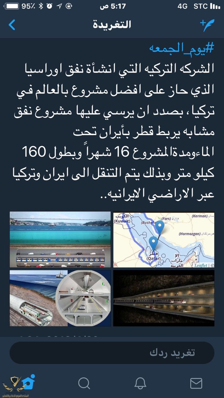 بغض النظر عن ان مشروع جسر او نفق بين الدولتين مضحك لإعتبارات كثيرة لكن نفق اوراسيا طوله 5 كلم واستغرق العمل فيه 5 سنوات وهذا يقول نفق بين قطر وايران طوله 160 كلم يتم انجازه خلال سنه و 4 شهور !
