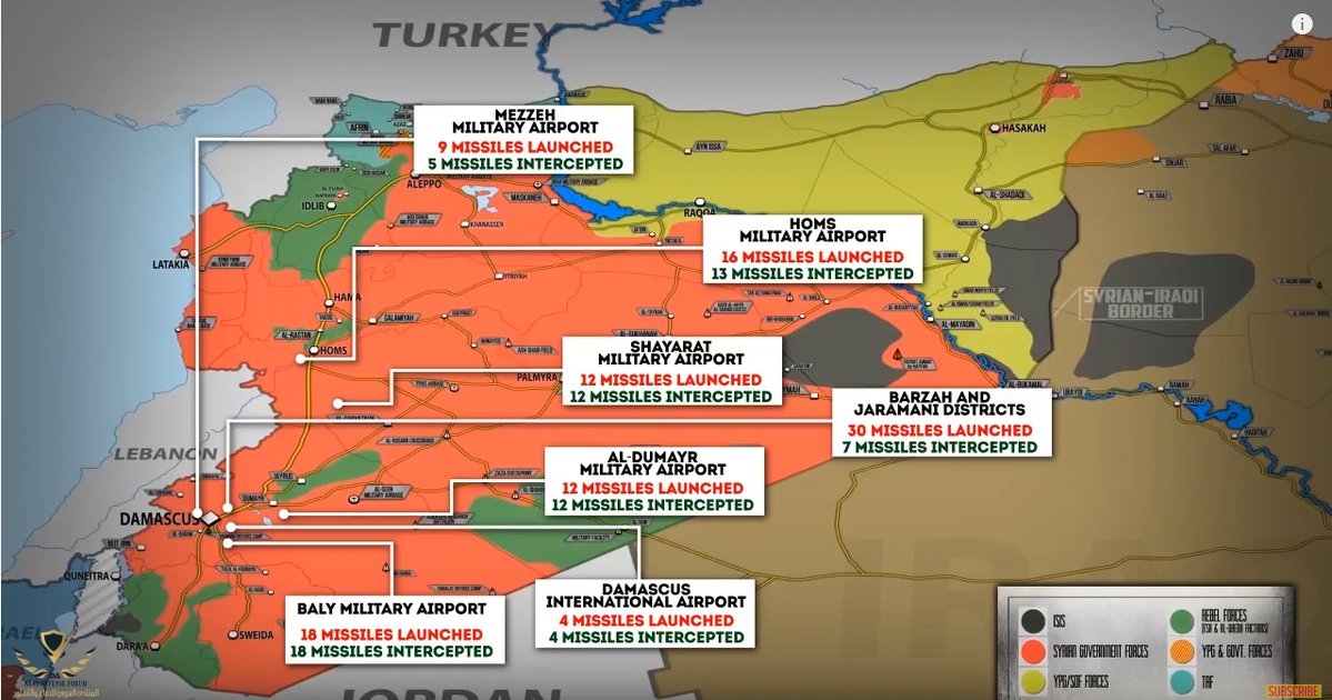 مثلا , مثلا في مطار المزة العسكري , 9 اطلاقات , تم اعتراض خمس منهم , مع مقارنة الادعاء السوري بان اربع صواريخ فقط هي من اصابت المطار بصور الجنرال لا اري تناقض بواقع الخبر لكن بطريقة عرضه من الطرف الامريكي