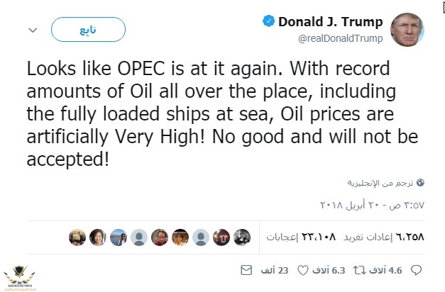ترامب بنفسه غرد اليوم متضايقا من زيادة أسعار النفط ,,,,, تحليلاتك خيالية جدا وبعيدة عن الواقع ومع إحترامي فيها فلسفه واجد