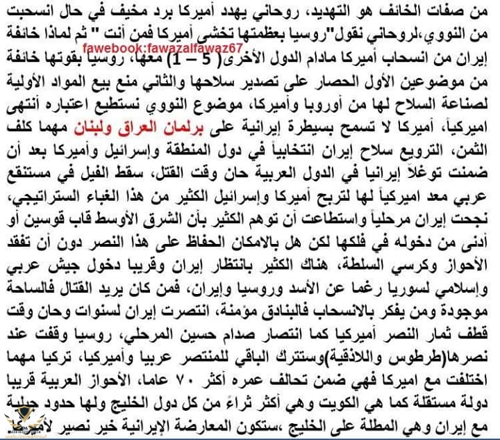 اتفق مع كل كلمه..العرب والفرس في قتال ازلي منذ اكثر من 15 قرن..والغرب وانجليز تحديدا اكثر من يعرف بهالشي..وهم من جابوا خوميني للحكم وتركوا له المجال لتحقيق احلامه باعادة امبروطوريه فارس تحت غطاء ديني..والهدف كان ضرب العرب بالفرس واعادتهم للعصر الحجري بالمقابل تقدم اليهود اقتصاديا وعلميا وعسكريا وثقافيا عنا..اليوم ايران توسعت اكثر من الازم وانتهاس دورها ودمرت العراق وسوريا على اكمل وجهه وحان الوقت لسحقها او اعادة تشكيلها مره اخرى لاهداف اخرى..لكن السؤال المهم كم من العرب السذج بيقتل قبل انهاء مشروع الفروس؟!!