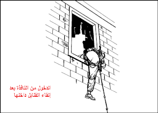 - يتم الدخول ضمن النافذة بأصغر شكل يمكنك إظهاره, باستطاعتك إدخال رأسك أولا, لكن أفضل طريقة هي إدخال إحدى الساقين و من ثم الدخول بشكل جانبي (الشكل التالي يظهر كيفية الدخول باستعمال الحبل الذي ينصح بتجنبه لصعوبته).