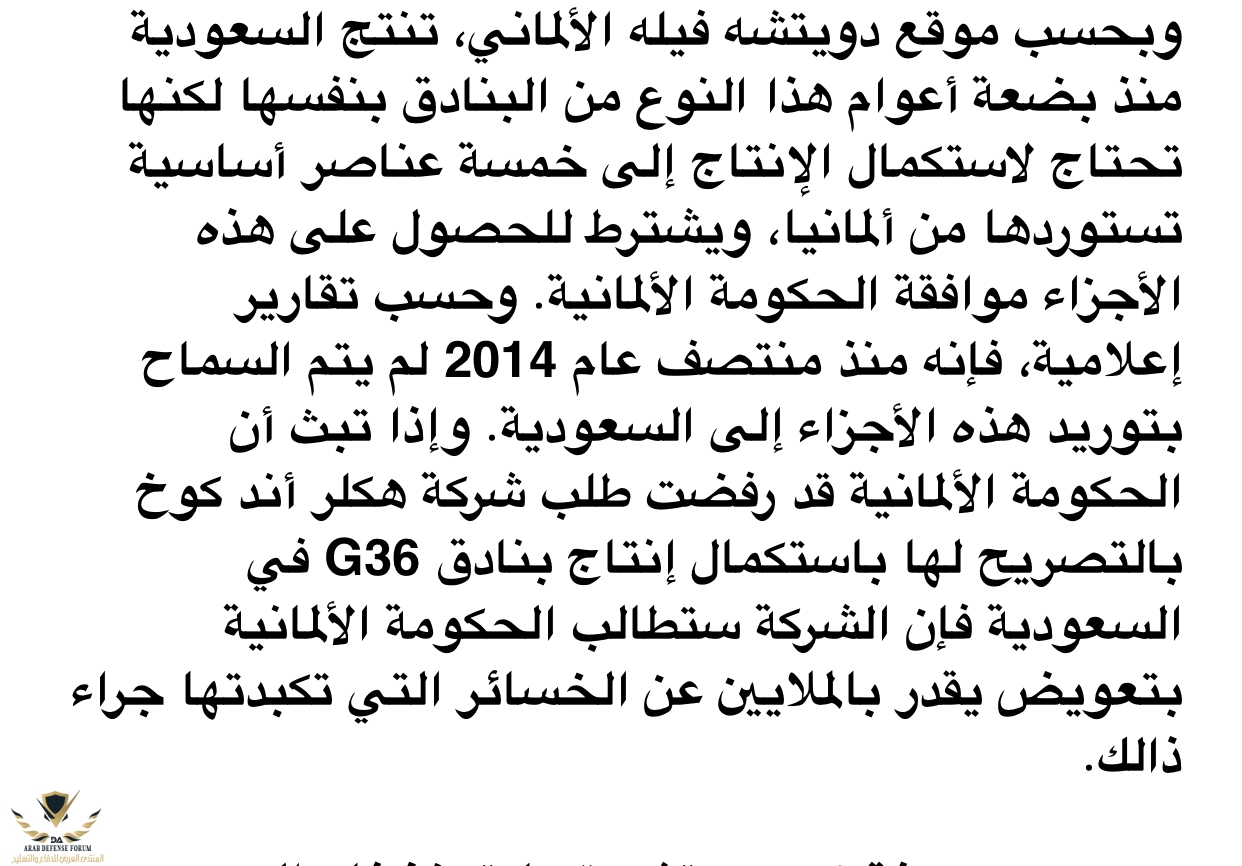 لا يوجد شيء اسمه بندقية سعودية، فهي ألمانية و يلزم موافقة الحكومة الالمانية لانتاجها و تصنيعها بل يمكنها عرقلة انتاجها كما تفعل حالياالبندقية السعودية جيدة جدا