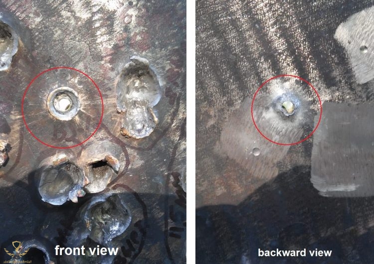 التجربة كانت بعيار 7,62mm وهي بوزن 13 غرام واتبتت على قدرة اختراقية ب25mm للحديد الصلب أو 454HBW و 80mm من الهيكل الأصلي ،الرصاصات بعد اختراقها لكافة الدروع لم تتأثر ولم تتضرر.