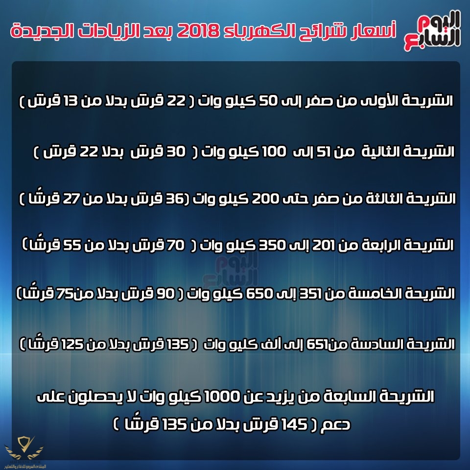 الشريحة الثالثة بدأت من صفر حتى 200 كيلو وات وزادت إلى 36 قرشا بدلا من 27 قرشا بنسبة 33.3 في المئة، والشريحة الرابعة من 201 إلى 350 كيلو وات إلى 70 قرشا بدلا من 55 قرشا بنسبة 27.3 في المئة، أما الشريحة الخامسة من 351 إلى 650 كيلو وات فأصبحت 90 قرشا بدلا من 75 قرشا بنسبة 20 في المئة، والشريحة السادسة من 651 إلى ألف كليو وات 135 قرشا بدلا من 125 قرشا بنسبة 8 في المئة وأزال التغيير الجديد الدعم عن المستهلكين الذين يستخدمون أكثر من ألف كيلو وات شهريا وتحاسبهم على 145 قرشا عن الكيلو وات الواحد بدلا من 135 قرشا بنسبة زيادة 7.4 في المئة.