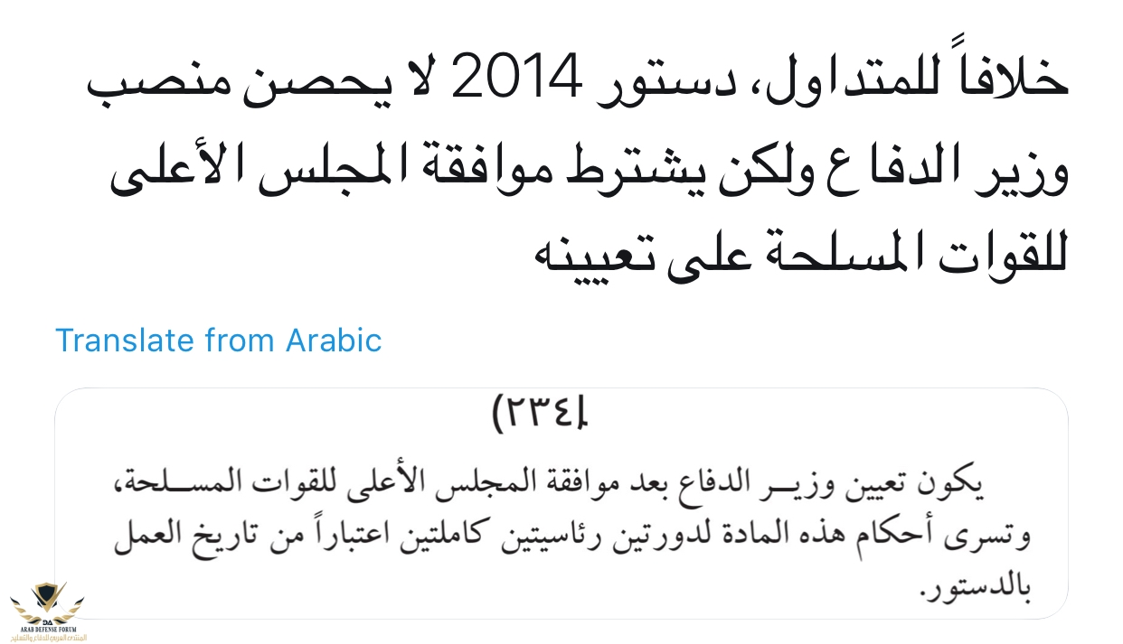 طبقاً للمادة 234 يحق للرئيس اقالة وزير الدفاع وتعيين وزير جديد بشرط موافقة المجلس الاعلي للقوات المسلحه علي تعيين الوزير الجديد