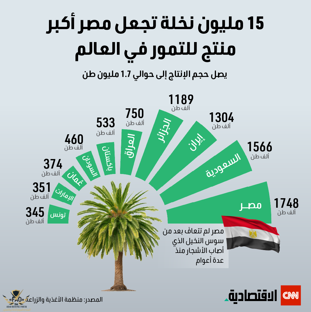 نشرت «سى إن إن الاقتصادية» الأمريكية إنفوجراف يوضح قائمة بأكثر الدول إنتاجاً للتمور فى العالم، حيث تستقطب طلباً كبيراً خلال شهر رمضان بشكل خاص، وجاءت مصر فى المركز الأول عالمياً فى إنتاج التمر بمعدل 1748 طناً فى العام.