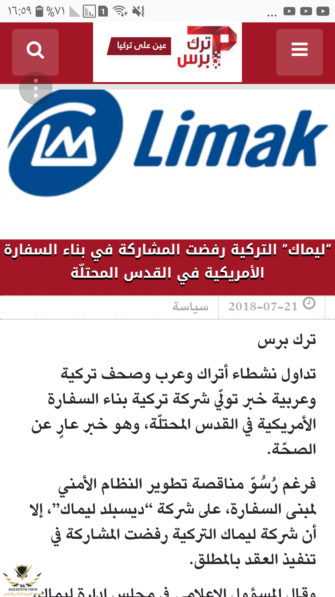 والخبر منتشر في الصحف التركية يشنعون فيه على الشركة التركية ليماك القابضه لاتحادها مع شركة دس بلت الامريكية في بناء السفاره