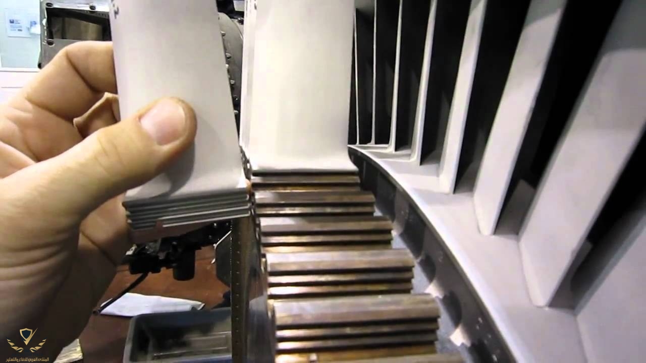 اولا نشوف المحرك من الداخل يحتوي على عدد كبير من التوربينات تسمى ضواغط بسبب ضغطها الهواء لداخل غرفة الاحتراق والخارج منها ايضا