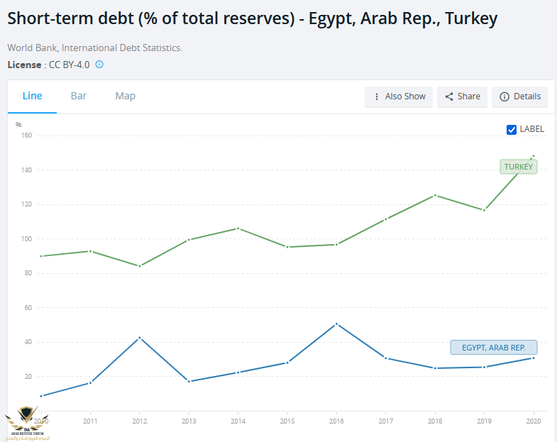 3- نسبة الديون قصيرة الأجل الى احتياطى النقد الأجنبى (31% فى مصر مقابل 148% فى تركيا)