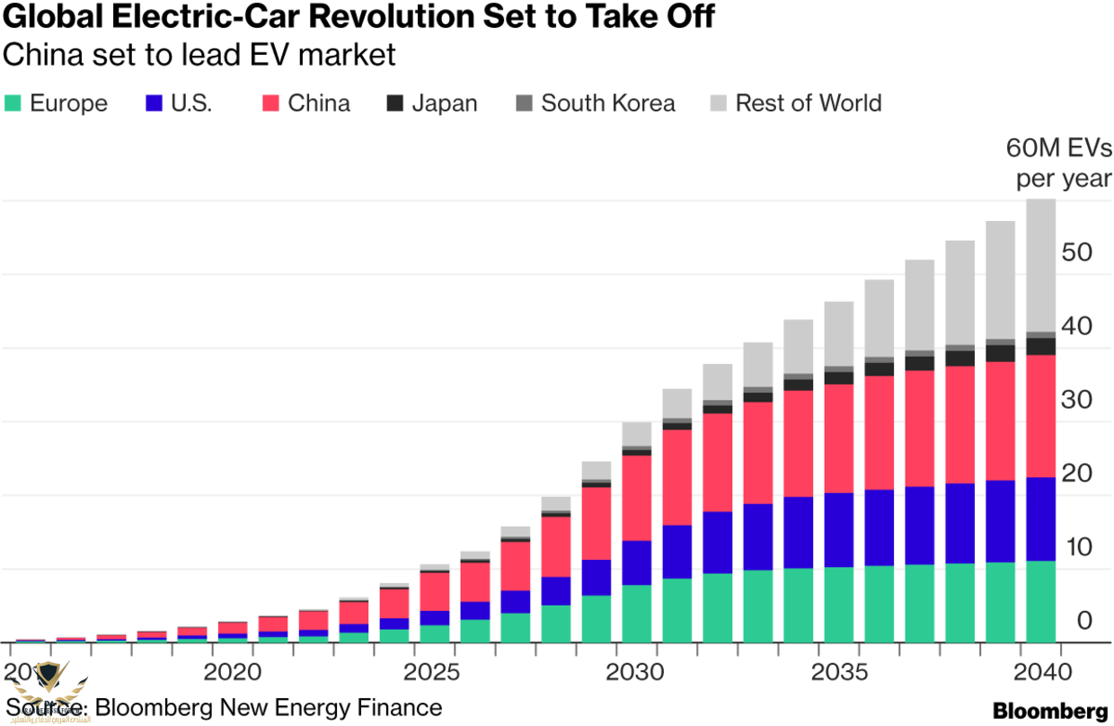2040 ..!!1.2 مليون سيارة كهربائية بيعت في العالم سنة 2017 ويتوقع أن يصل العدد إلى 60 مليون سيارة سنويا سنة 2040.. التحول الكبير من السيارات ذات محركات الإحتراق الداخلي نحو المحركات الكهربائية يتوقع أن يحدث بين 2025 و 2030