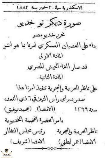 في 19 سبتمبر عام 1881 أصدر الخديوى توفيق مرسوما بإلغاء الجيش المصرى، وصدر هذا القرار، فى أعقاب فشل الثورة العرابية، ودخول القوات البريطانية إلى مصر، والذى كان بدية للاحتلال الذى استمر لمدة سبعين عاما فى مصر.