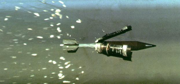 بعد اختراق الدرع تنشر آلاف الرقائق و القطع المعدنية المنصهرة بسرعة 1.7 كم / ثا