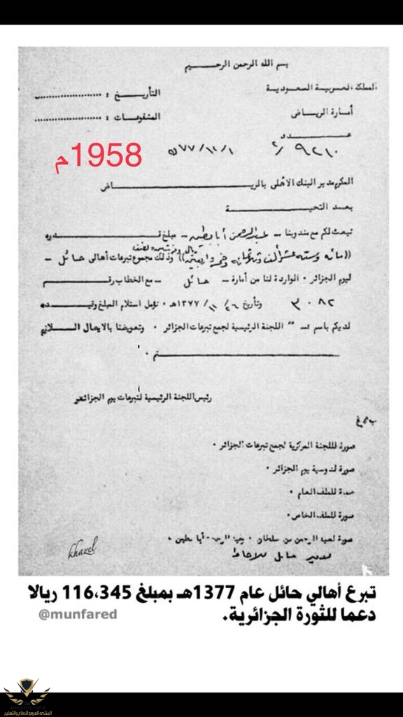 الصورة الثانية تبرعات أهلنا في حائل العز و الشموخ للثورة الجزائرية