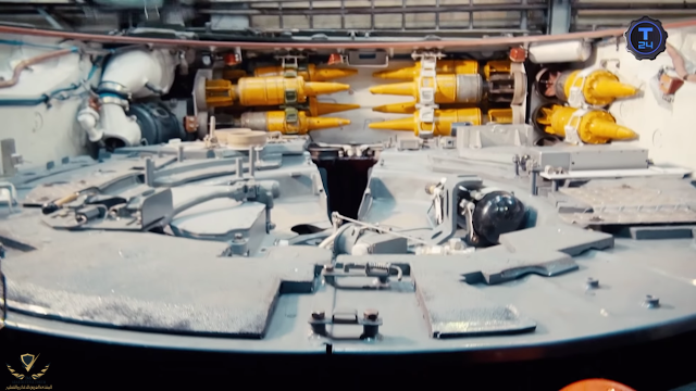 بينما دبابه الأبرامز تستطيع الوصول الي القذائف المخزنه في برجها من الداخل.
