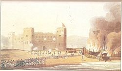 حاكم عمان وفي 11 نوفمبر عام 1809م وصلت سفن الحملة راس الخيمة ولكن ضحالة المياه امام سواحل راس الخيمة اضطرت السفن إلى الوقوف على مسافة تتراوح بين ميلين وأربعة أميال و بدأت السفن قصف المدينة طوال يوم 2 نوفمبر من نفس العام.