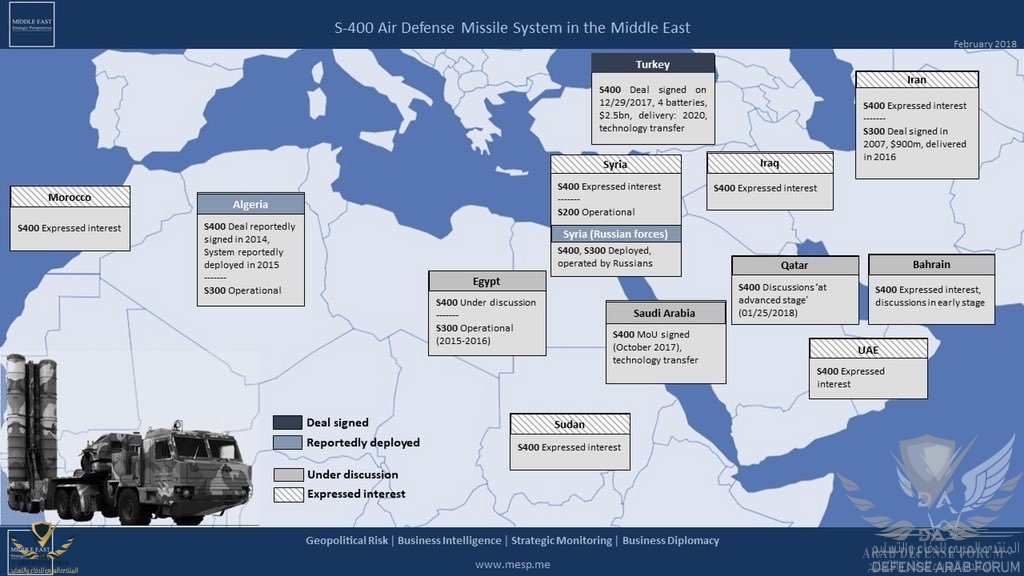 Reportedlyصورة من موقع Middle East Strategic Perspectives توضح الدول المهتمة و المشغلة لمنظومة إس 400 و تظهر أن الجزائر تشغل المنظومة منذ 2015