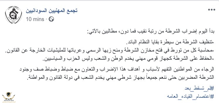 لا يمكن أن تمنع التظاهر السلمي مهما كان الانتماءتأكيد من شرطة الخرطوم بالغاء مسيرة نصرة الشرعية المقررة غداً التي دعوا اليها اذيال النظام بأمر من الفريق اول محمد حمدان (حميدتي) نائب رئيس المجلس العسكري الانتقالي وعدم اصدار تصريح لها