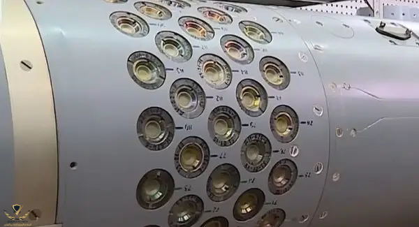 - عشرات الثقوب الصغيرة التي تنبعث منها مادة دافعة - تستخدم لتوجيه الصاروخ إلى الهدف عبر نظام تحديد المواقع العالمي (GPS) بالنفث النبضي في Vilkha-M