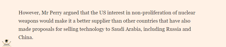 "ومع ذلك ، قال السيد بيري إن اهتمام الولايات المتحدة بعدم انتشار الأسلحة النووية سيجعلها مورداً أفضل من الدول الأخرى التي أيضاً قدمت عروض المقترحات لبيع التكنولوجيا إلى المملكة العربية السعودية، بما في ذلك روسيا والصين".