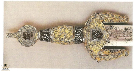 وكان المقبض والحامي معأ تشكل أسد رافعاً إحدى يدية ولا يخلو النصل من النقوش وقد يكون مزيناً بالذهب أو الفضه
