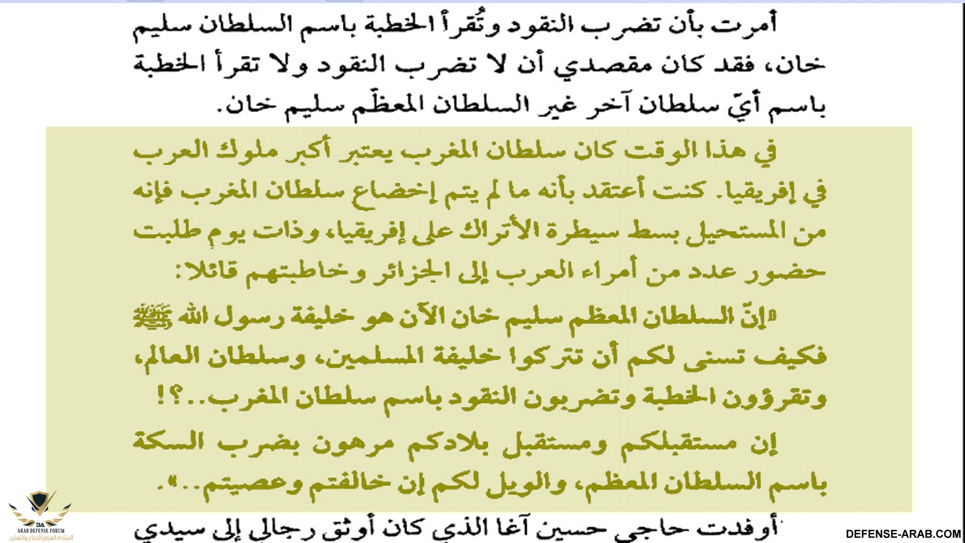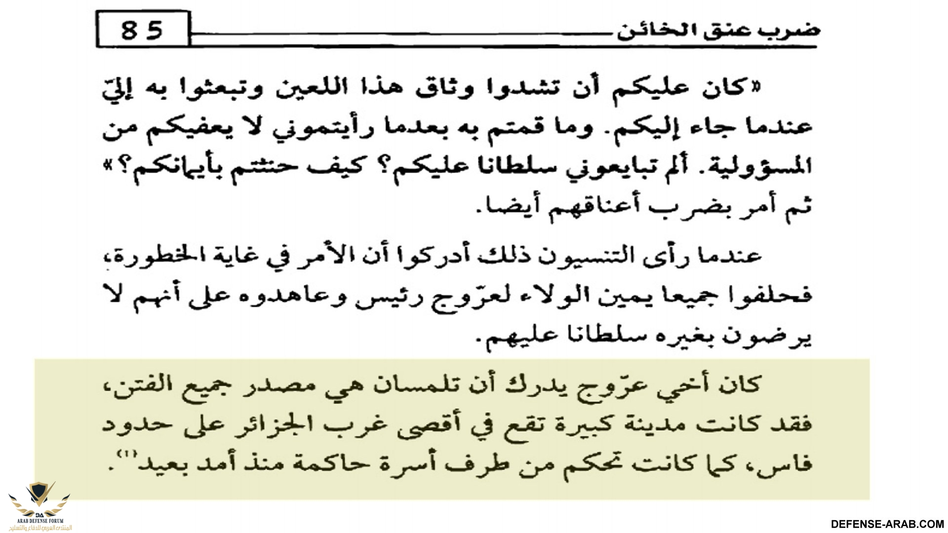 شكــرا للأخــوة جميــعا على مرورهـم .. و إجــابة على الأسئلـة التي طرحــتها أخي الشبح .. بخصوص نقطـة الاسبـان فإنهم لم يكونوا بصدد مهاجمـة وهران لأنــهم كانــوا يحتلــونها أصلا ، القـصد هنا هو التحرك الاسباني ضد مستغانم لكن الأمر مردود عليهم تاريخيا ، فـمعركة واد اللبن و ما سبقها من هجوم حدثت بين مارس و ابريل بيـنما لم يتحرك الاسبان عسكريا من وهران حتى سبتمبر من نفس العـام .. 6 أشهر فارق بين الأمريـن ( أعتقـد توضح التزييف العثماني الآن )