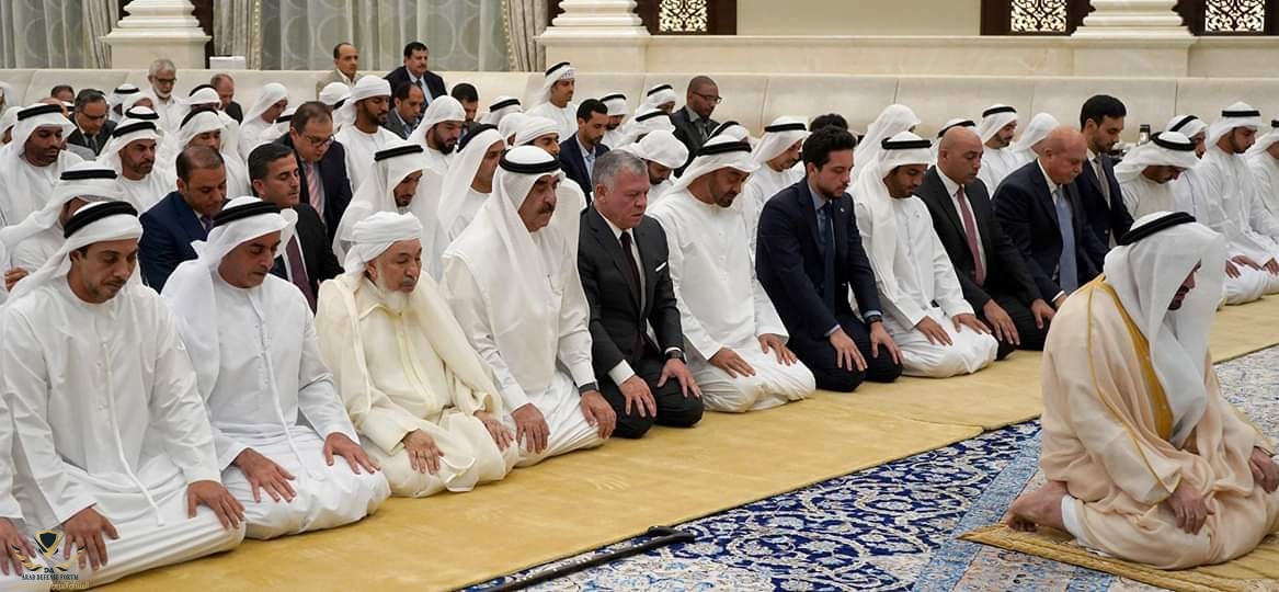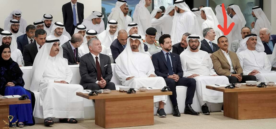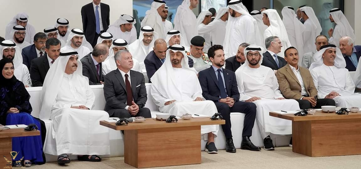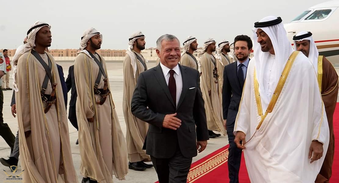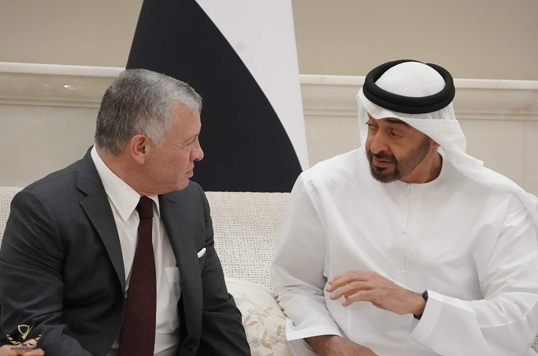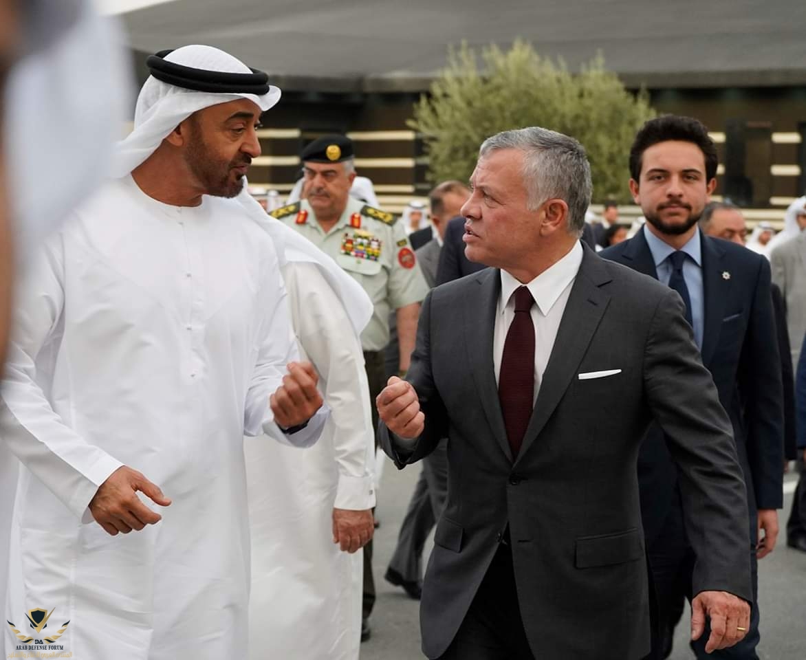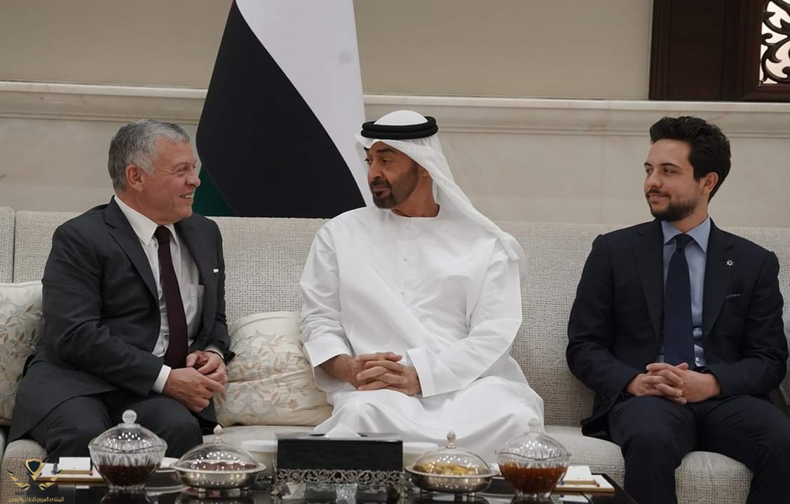 سمو الشيخ محمد بن زايد آل نهيان ولي عهد أبوظبي نائب القائد الأعلى للقوات المسلحة في دولة الإمارات العربية المتحدة في مقدمة مستقبلي جلالة الملك عبدالله الثاني وسمو الأمير الحسين بن عبدالله الثاني، ولي العهد، في مطار البطين في العاصمة أبوظبي
