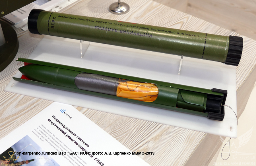 يسمح لك هذا المجمع بتلقي مقاطع فيديو وصور فوتوغرافية للمناطق التي يتعذر فيها الحصول على هذه البيانات بالطريقة المعتادة. وبالتالي ، يمكن استخدام "العين" في حالات الطوارئ أو أثناء القتال ، عندما لا يكون هناك خط رؤية مباشر ويكون العدو خلف العقبات أو على أسطح المباني.