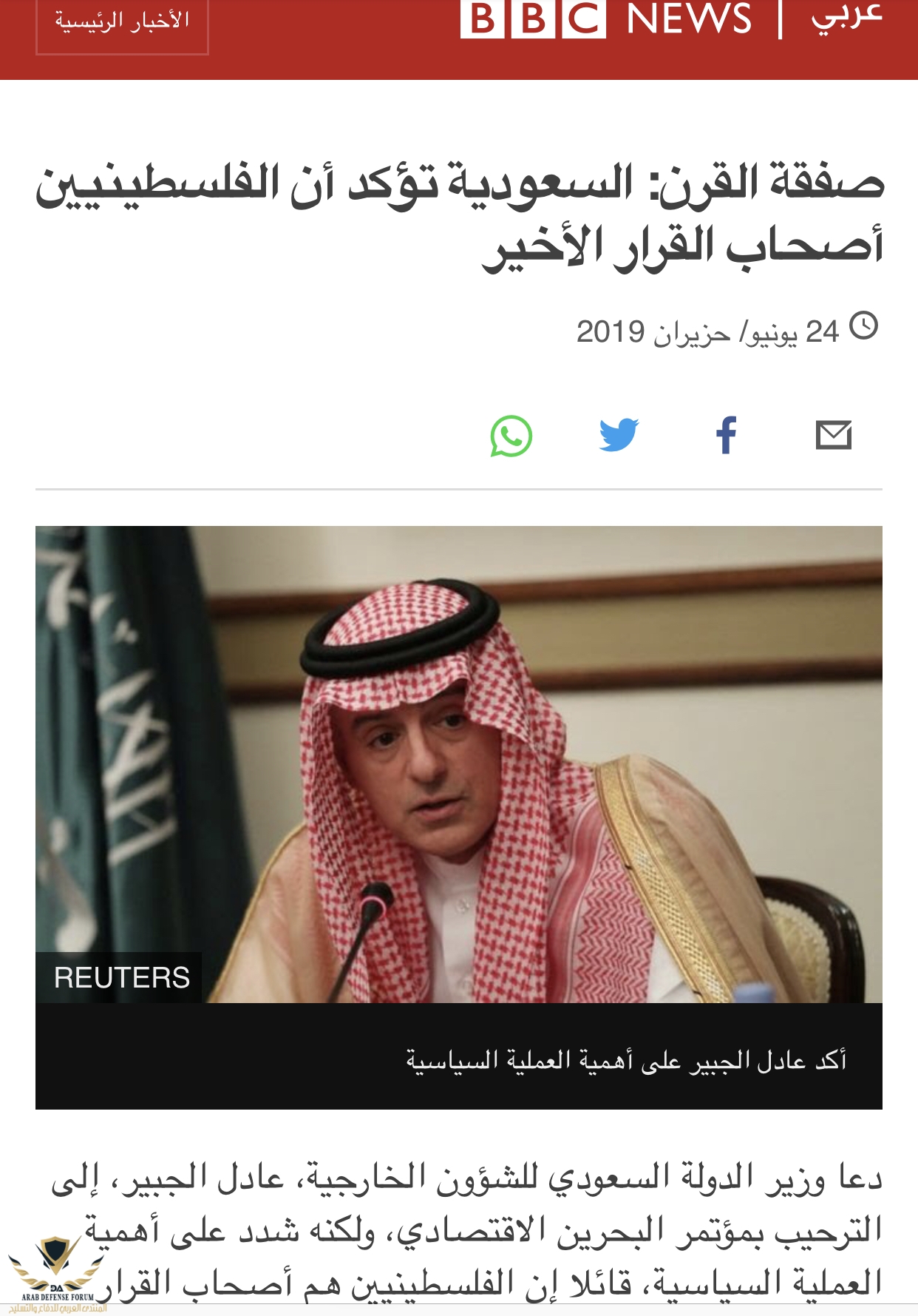 دعا وزير الدولة السعودي للشؤون الخارجية، عادل الجبير، إلى الترحيب بمؤتمر البحرين الاقتصادي، ولكنه شدد على أهمية العملية السياسية، قائلا إن الفلسطينيين هم أصحاب القرار الأخير فيها.