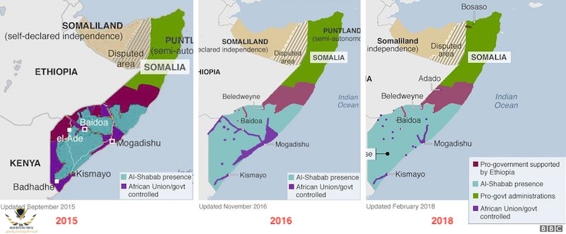 كما تلاحظون الوضع منذ العام ٢٠١٥ من السئ للأسوأ. الانفجارات باتت شبه يومية في عاصمته مقديشو، ناهيك عن المناطق الشاسعة التي تسيطر عليها الحركات الارهابيه كما ترون.