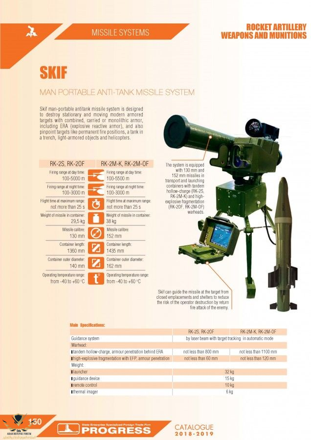 - 40 منصة الصواريخ المحمولة المضادة للدبابات (Skif 215T) الذي يتضمن قاذفات الصواريخ ، جهاز التوجيه ، وحدة تحكم عن بعد ، المنظار الحراري (Eye-LR-S Aselsan) .