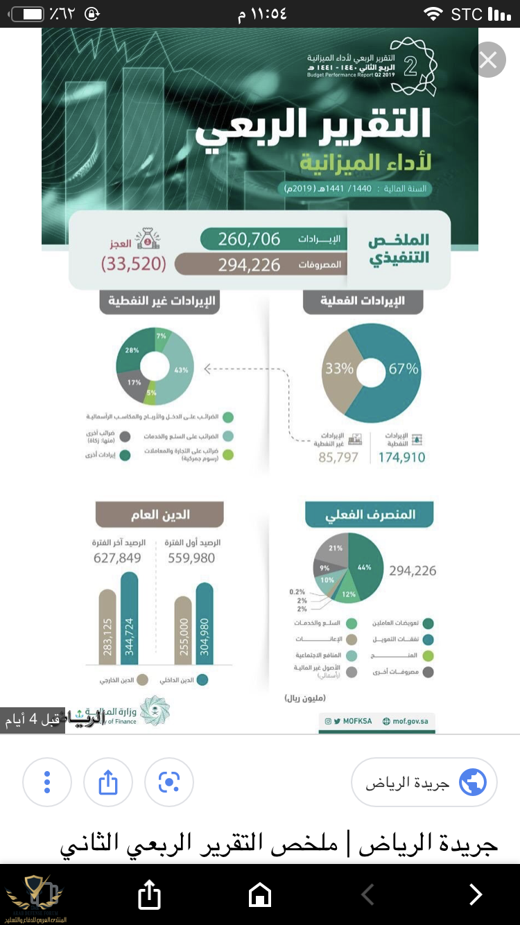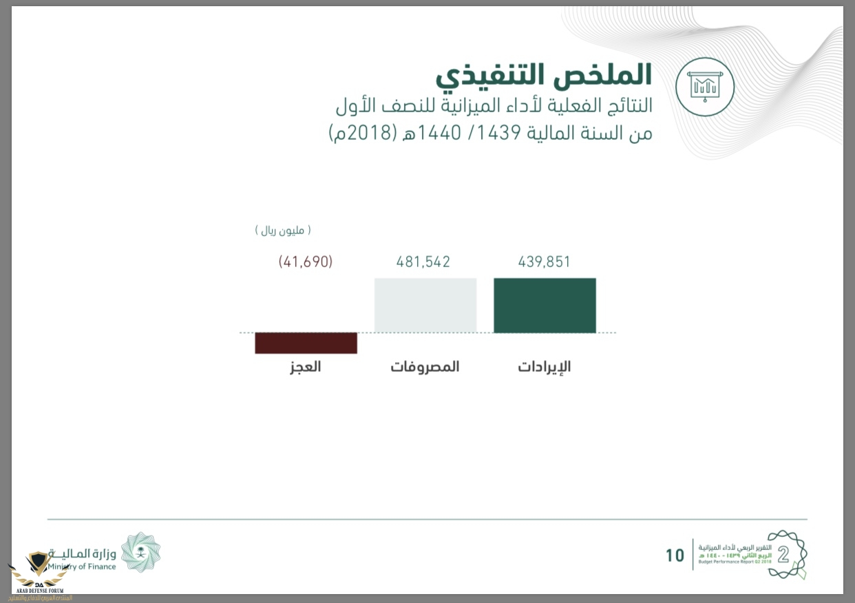أما عن نتائج الربع الثاني من عام 2019، فقد بلغت الإيرادات نحو 260.706 مليار ريال، والنفقات نحو 294.226 مليار ريال، وبذلك بلغ عجز الميزانية خلال الربع الثاني نحو 33.52 مليار ريال.