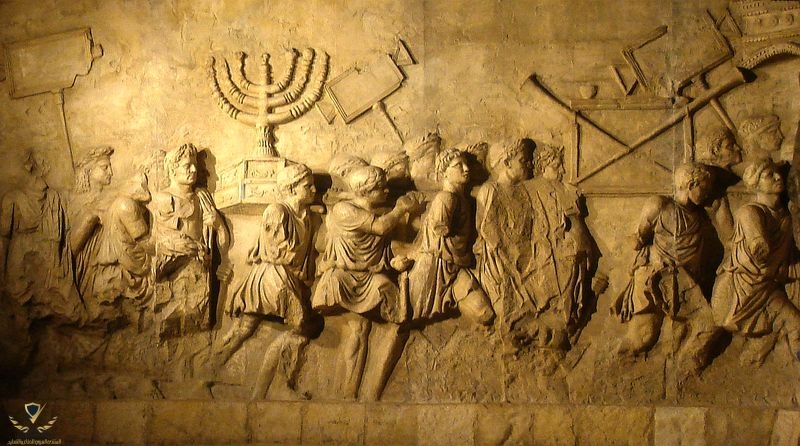 عملية تدمير ونهب الهيكل لازالت منقوشة في حائط بوابة النصر في روما القديمة او ما يسمى قوس تيتوس Arch of Titus