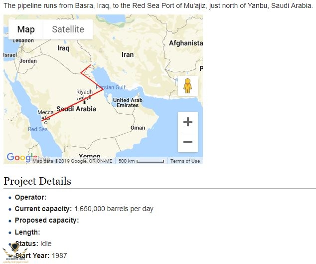صوره توضح خط الانابيب العراقي والذي يعرف بـ IPSA , بدأ التشغل سنة 1987 وحالته متوقف (تم وقف التصدير منه بعد غزو الكويت)