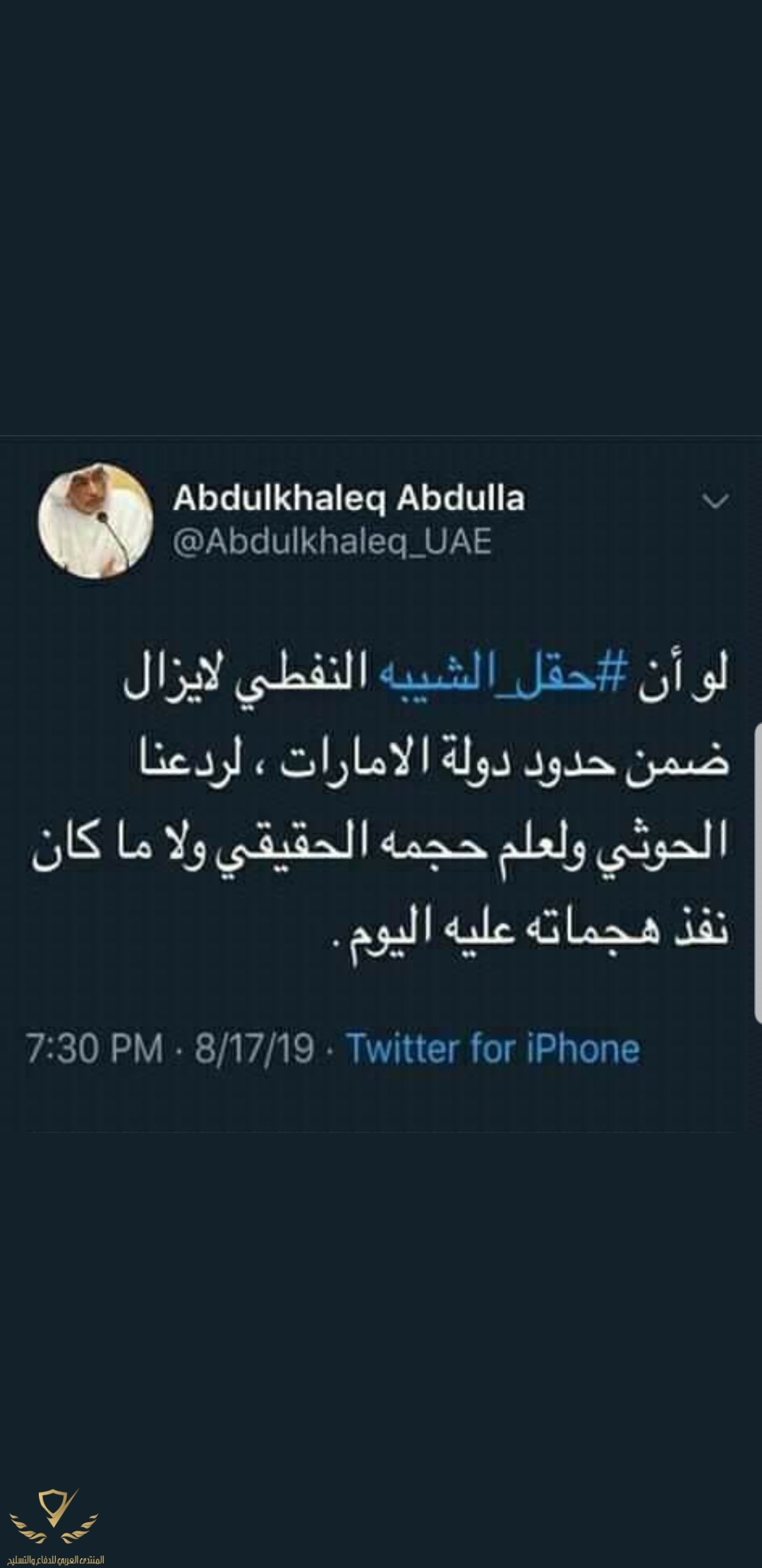 لا علم لي كيف ينظر الإخوة في الإمارات للإخوان المسلمين هل تعتقدون أنهم كائنات أحادية الخلية موجودين في كل شي حولنا لان ربطهم بكل الأحداث امر في أفضل الحالات يثير الضحك نحن هنا لا نتكلم عن علاقة السعودية والإمارات التي تحبون أن تروجوا لها كحلف مقدس تماما مثل الحلف الذي دعى له احد قياصرة روسيا ايّام نابليون. الكلام لماذا محاولة التركيز على تغريدة كتبها قطري يقول فيها بوضوح ان الإمارات مطامع في حقل شيبة مثل مطامعها في عدن وتحويلها الى تهديد قطري اخواني حوثي إيراني إمبريالي لحقل الشيبة هذا يجعل الشكوك تراودنا عن رغبة بإخفاء حقيقة أخرى