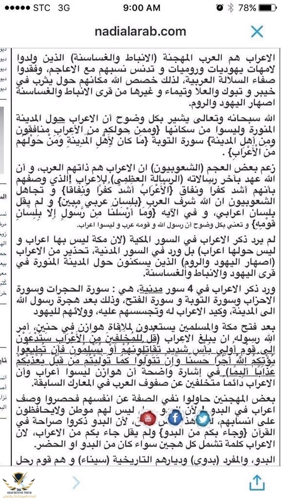 يا عزيزي الاعرابي المستعرب مجهول النسب لاتجعل حقدك الشعوبي على العرب يعميك عن الحق، فسوف ارفق صورة لحديث للنبي ﷺ يوضح الفرق بين الباديه والاعراب وصوره اخرى توضح الفرق بين الاعراب والبوادي..