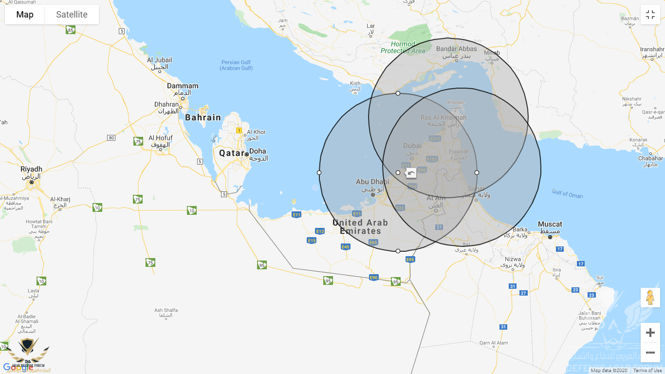هكذا يبدو مدى 300 كم من نقطتين اطلاق فحسب ( احدها في رأس الخيمة والاخرى بقرب ابوظبي) .. لاحظ التغطية والتقاطع