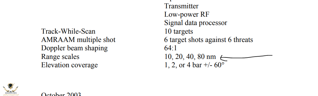 اللعب بالارقام لن يضعك في موضع جيد فانت مجددا تقوم بضرب كلام المجلة حول زيادة مدى الكشف ب30% بعرض الحائط مجددا اقولها و اكررها امام المصادر الرسمية الامريكية لا يمكن الحديث عن اي كلام تخريفي و التي لحد الان لم تنشر الارقام الدقيقة و انما اكتفت بوضع مصطلح greater detection and tracking ranges و المصطح وحده كفيل باثبات ان مدى رادار APG-83 تمت مضاعفته على الاقل 3 مرات