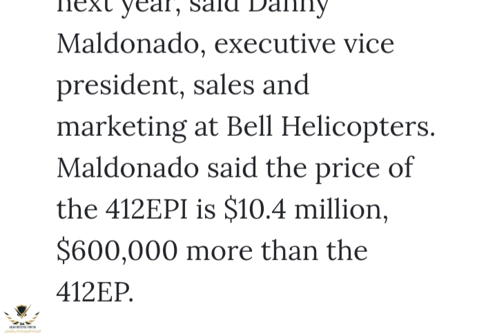 سعر المروحية الواحدة 10.4 مليون دولار .. يعني 36 مروحية ستكلف 375 مليون دولار باضافة التدريب و قطع غيار و غيرها الصفقة على الارجح ستكون في حدود 400 مليون دولار .. ثمن جد مناسب لتجديد اسطول المروحيات !!